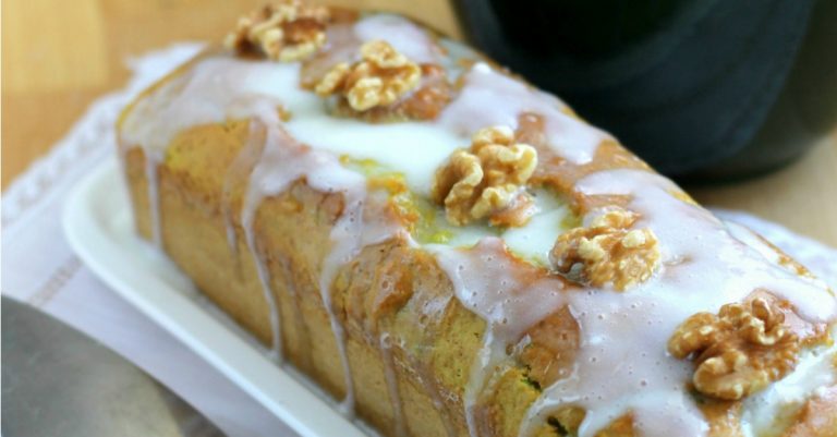 Para hacer el glaseado, batimos el yogur con el azúcar glas. Sacamos el bizcocho de aguacate del horno cuando podamos meter una brocheta y esta salga limpia. Dejamos enfriar y añadimos el glaseado, dejando que corra por los costados. Finalmente, decoramos con unas nueces de California.